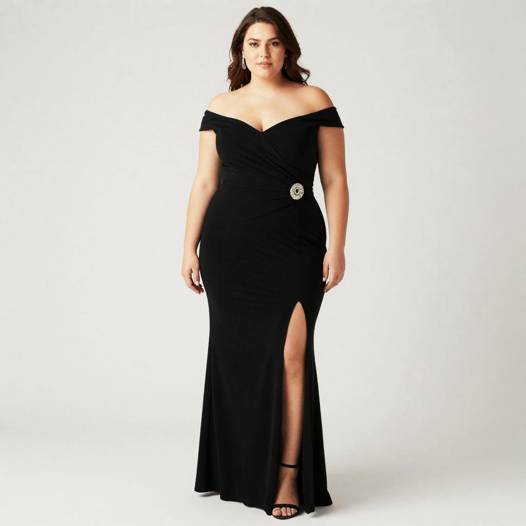 Portrait of a plus size woman wearing a black off-shoulder evening gown with a thigh-high slit and decorative brooch at the waist. She has long brown hair, is wearing drop earrings, and black high-heeled sandals. The background is plain and light-colored.