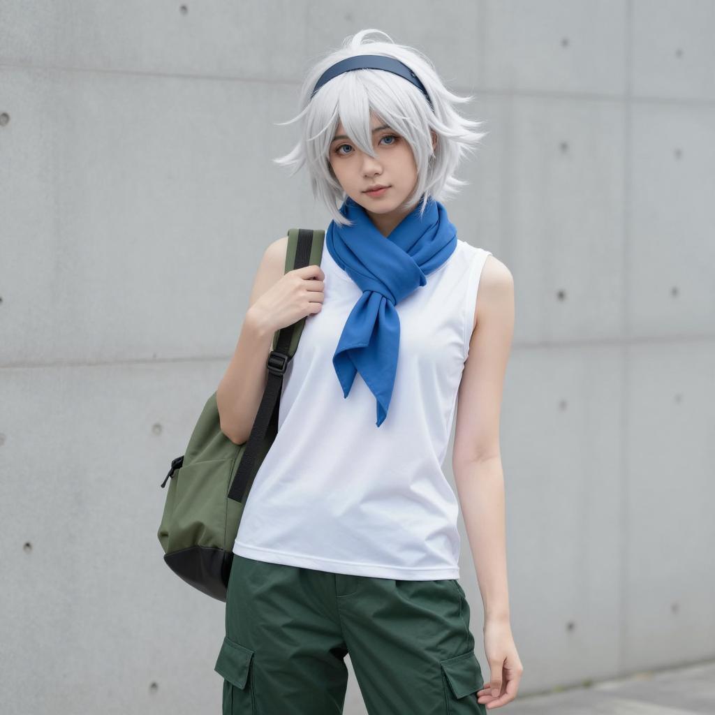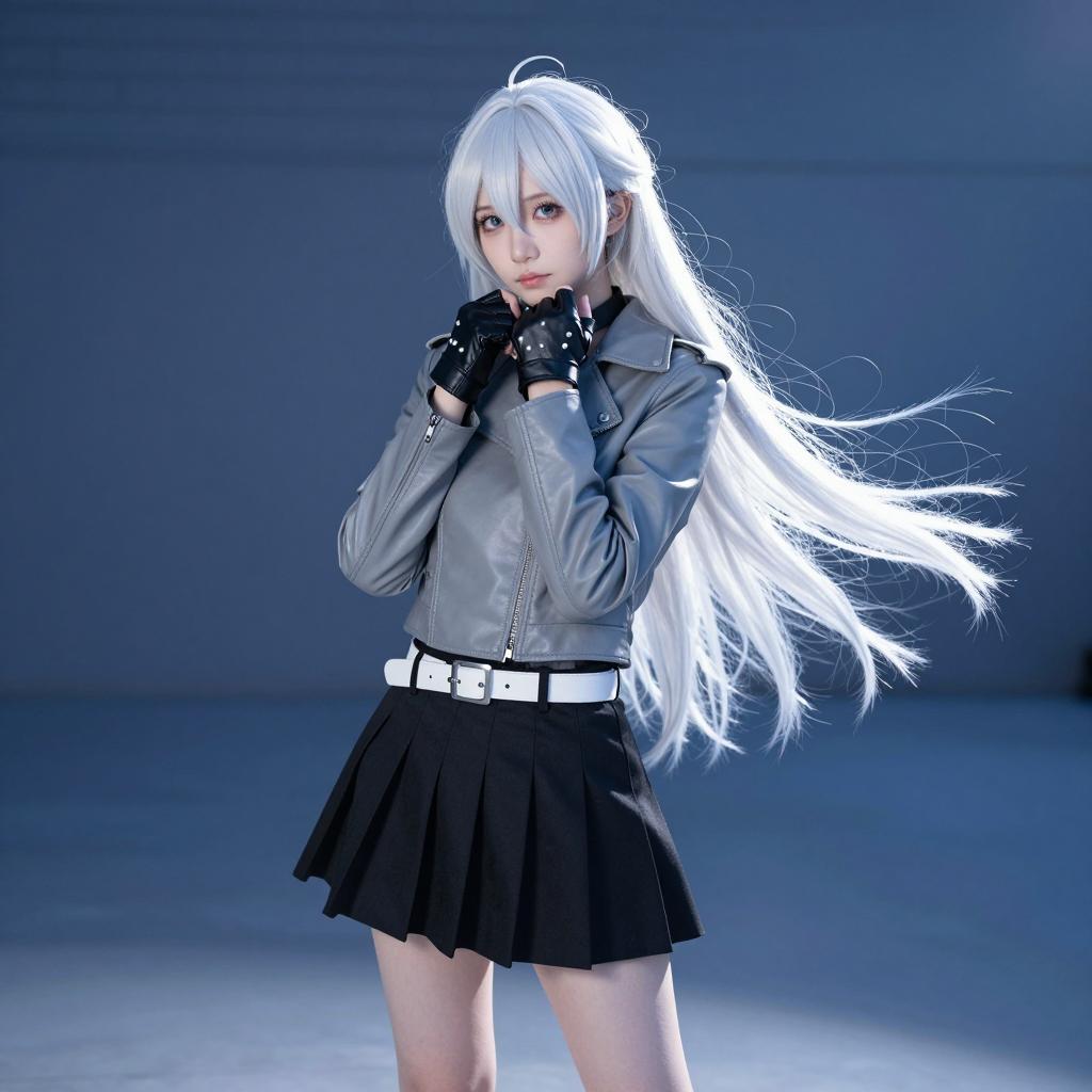 Cosplayer with long white hair, black gloves with white studs, gray leather jacket, white waistband, black pleated skirt, standing in front of a blue-lit background. Hair flows to the right. Hands near face, looking directly at camera. Bright spotlight from below. Brick wall background. Evening setting. Full-body view. Single person.