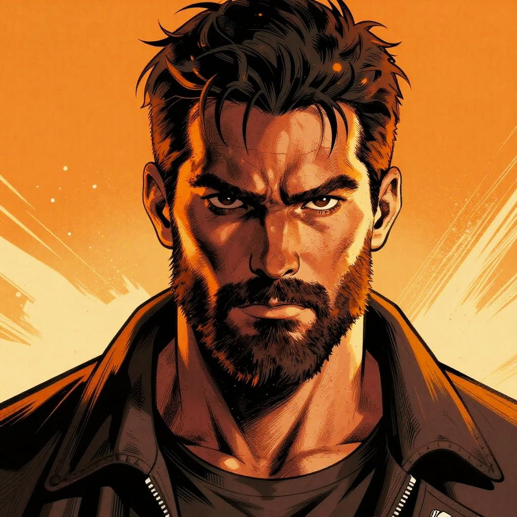 This is a digital drawing in a bold, comic style of a rugged, bearded man with short, dark hair and intense eyes. His face is illuminated by warm, orange lighting, creating dramatic shadows and highlights. He has a stern expression and is set against a dynamic, splattered background that adds energy to the image. The artwork is highly detailed with strong lines and vibrant colors.