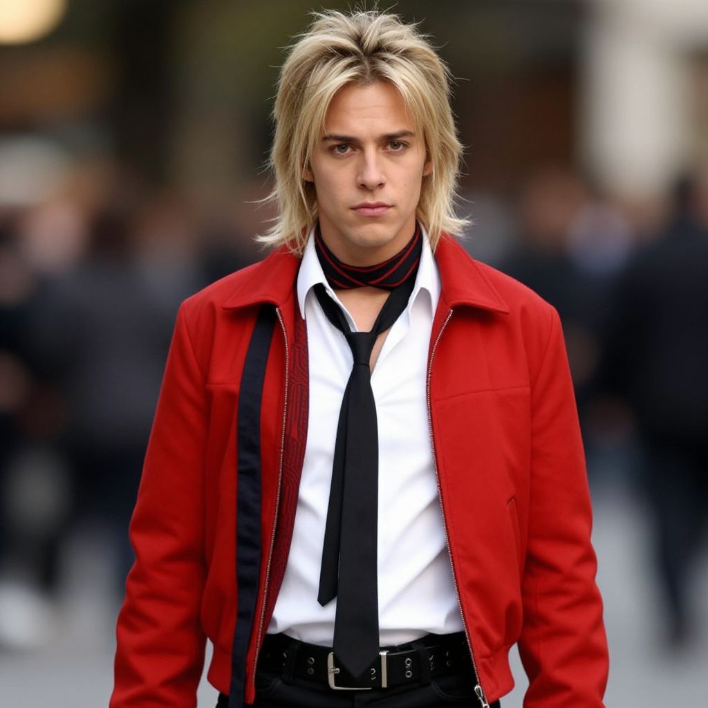 "axl rose costume, 1boy, solo, male focus, realistic, belt, blurry background, blonde hair, blurry, scarf, jacket, red jacket, looking at viewer, shirt, necktie Realistic photo of casual sexy person with pretty face"