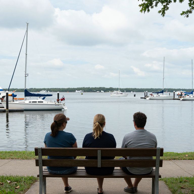 Three individuals sit on a wooden bench overlooking a serene waterfront scene in Sioux Falls, enjoying the view of sailboats docked along a pier and a bustling marina with multiple boats cruising across the calm water under a partly cloudy sky.