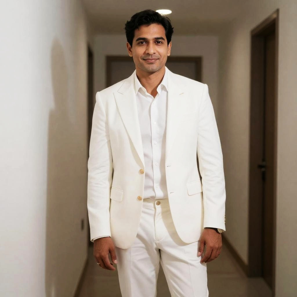 Man White Outfit White Party, man in white jacket and white shirt standing in a hallway
