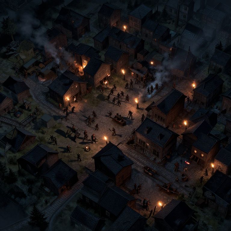 Aerial photograph of a nighttime, 19th-century Western town with wooden buildings, scattered torches, and people gathered, surrounded by smoke.