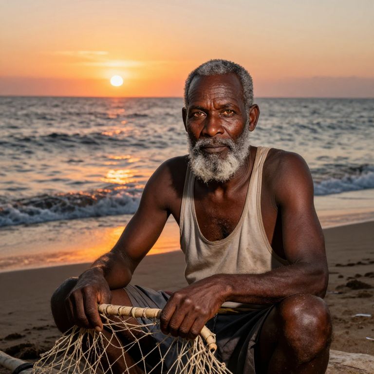 Imagine a portrait capturing the enigmatic essence of an African fisherman. His soulful brown eyes hold the wisdom of the sea, while his thick silver beard, weathered by the sun, tells tales of a life spent on the waters. The resilient hands, rough from labor, rest upon a rustic fishing net, a symbol of his enduring connection to the ocean. This noble figure, framed by a vibrant sunset, sits on the sandy shore, with warm hues from the rippling waves casting a soft glow upon his face. From an elevated angle, we look down upon him, evoking a sense of reverence for nature's bounty and the quiet strength found in simple, honest labor. The sunset over the ocean serves as a majestic backdrop, enhancing the sense of tranquility and contentment embodied by this proud fisherman.
