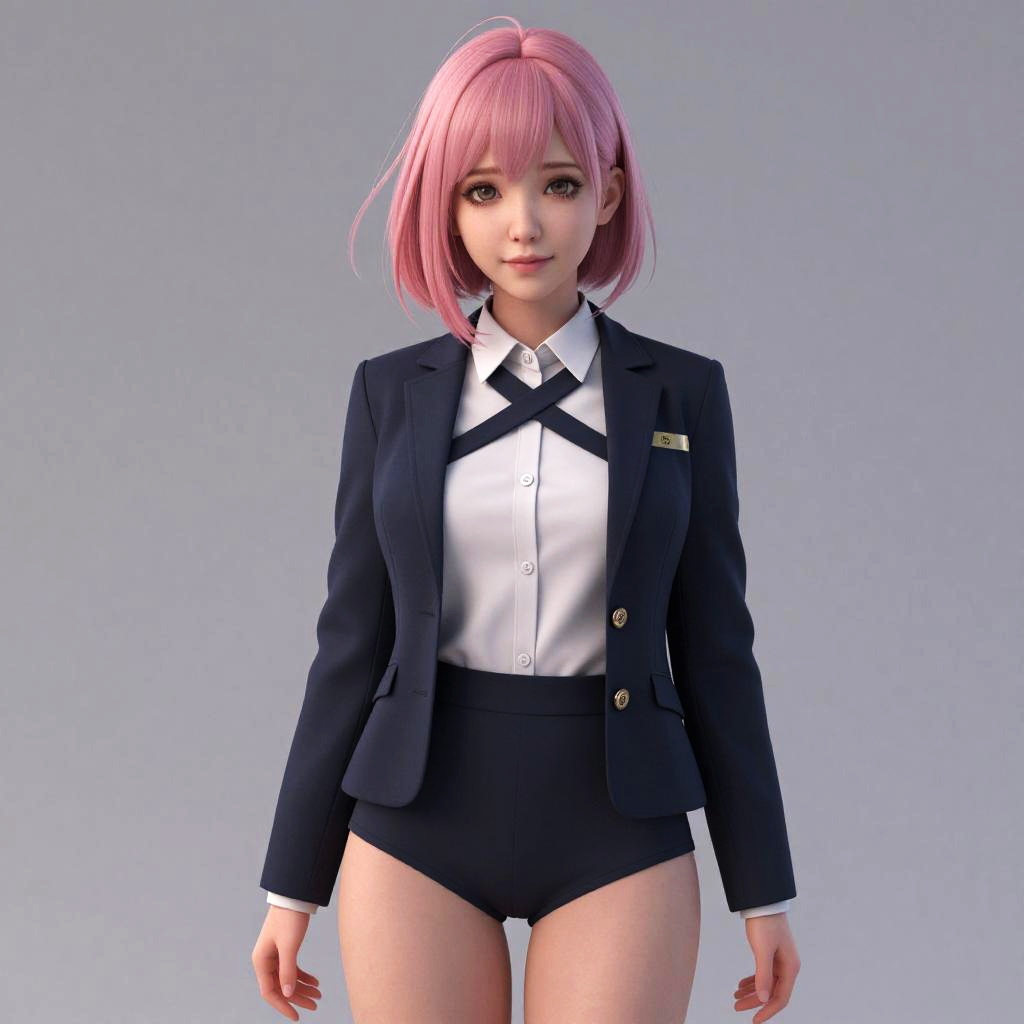 Photorealistic CGI image of a young woman with pink medium-length hair and bangs, wearing a fitted navy blue business jacket with gold buttons over a white collared shirt featuring cross-laced details. She is depicted with a subtle smile, detailed facial features including long eyelashes, and a mature yet youthful appearance. The outfit includes navy high-waisted shorts, creating a modern and fashionable business look against a neutral gray background.