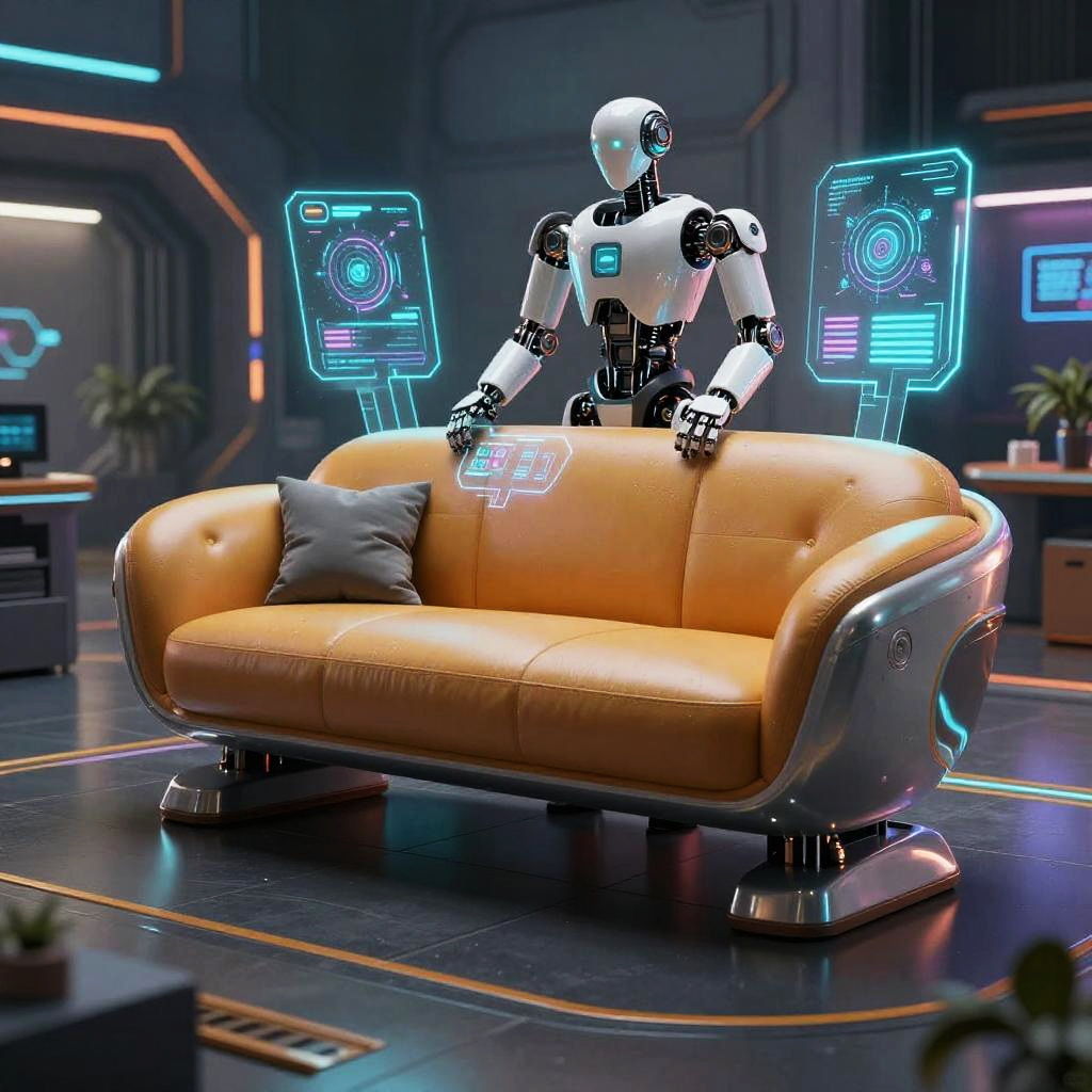 AI furniture generator showcasing conceptual designs of robotic furniture that rearranges itself, intelligent ambient controls displayed through holographic interfaces, metallic and glass textures, cyberpunk inspired environment with high detail and vivid colors