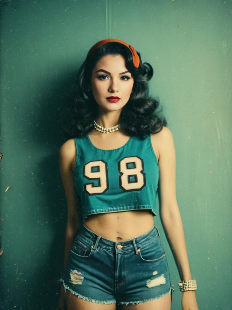 Young woman with vintage-inspired look wearing a teal cropped sports jersey-style tank top with number '98' printed in cream and outlined in black. She pairs it with high-waisted denim shorts featuring distressed details and frayed hems. Accessories include a red headband, pearl necklace, and chunky golden chain bracelet. The background is a muted green wall, adding to the retro aesthetic.