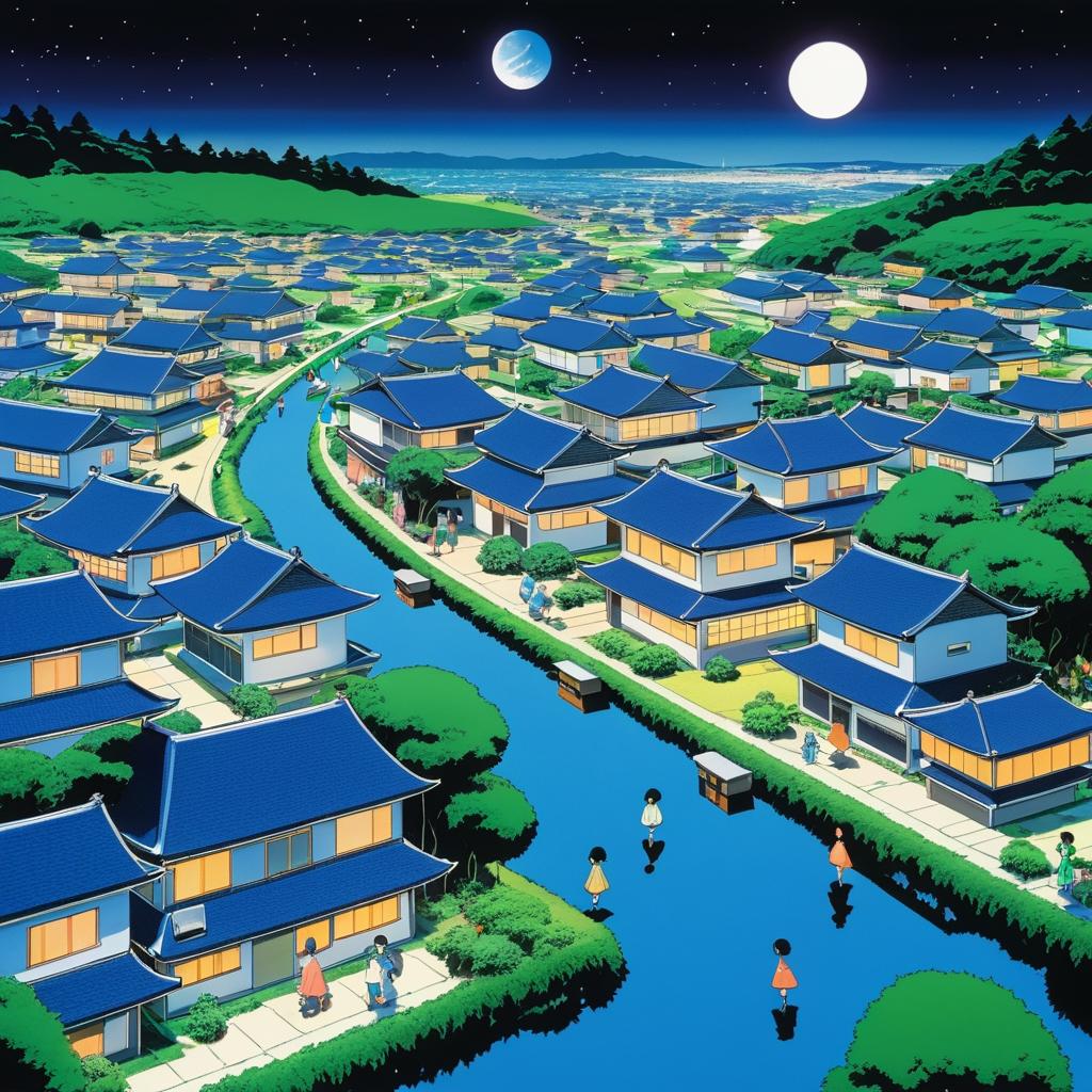 Manga-style illustration inspired by Rumiko Takahashi, depicting a serene small town at night with a winding river, numerous traditional-style houses with blue and orange roofs, lush greenery, and two alien moons visible in the starry sky, suggesting an otherworldly or alien invasion theme.