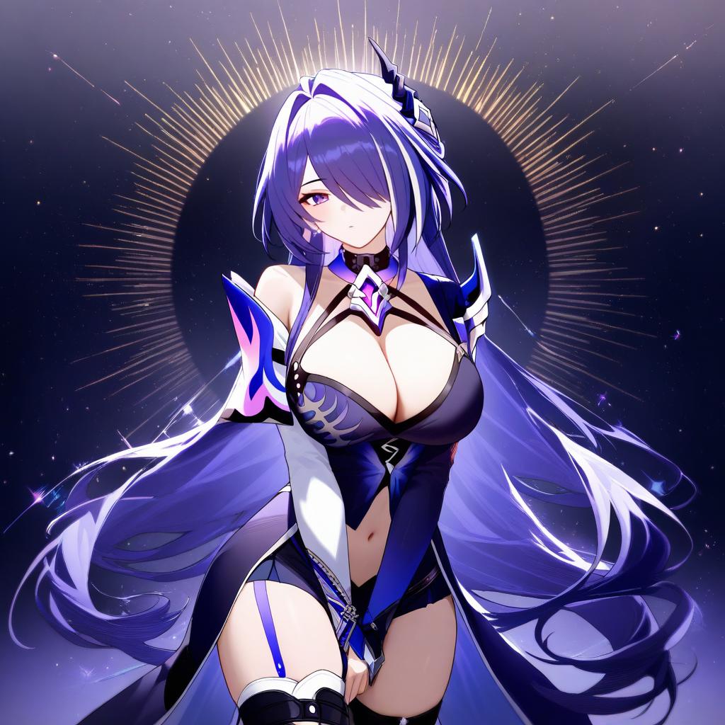 A digital anime-style illustration of a young woman with long purple hair, dressed in a shiny purple and black outfit with butterfly accents. She is seated cross-legged on a bed inside a room with arched windows showing a starry night sky and elegant chandeliers hanging from the ceiling. The character wears thigh-high black stockings and has a confident, serene expression.