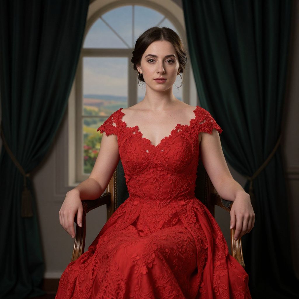 Photograph of a fair-skinned woman with dark brown hair, styled in an elegant updo, sitting in a wooden chair. She wears a vivid red, lace, Victorian-style dress with puffed three-quarter sleeves and a deep V-neckline. Her expression is calm and composed. The background features dark green curtains, a large arched window showing a scenic landscape, and a gold-framed painting on the left. The room has ornate molding and a classical ambiance. The lighting is soft, highlighting her dress's intricate lace patterns.