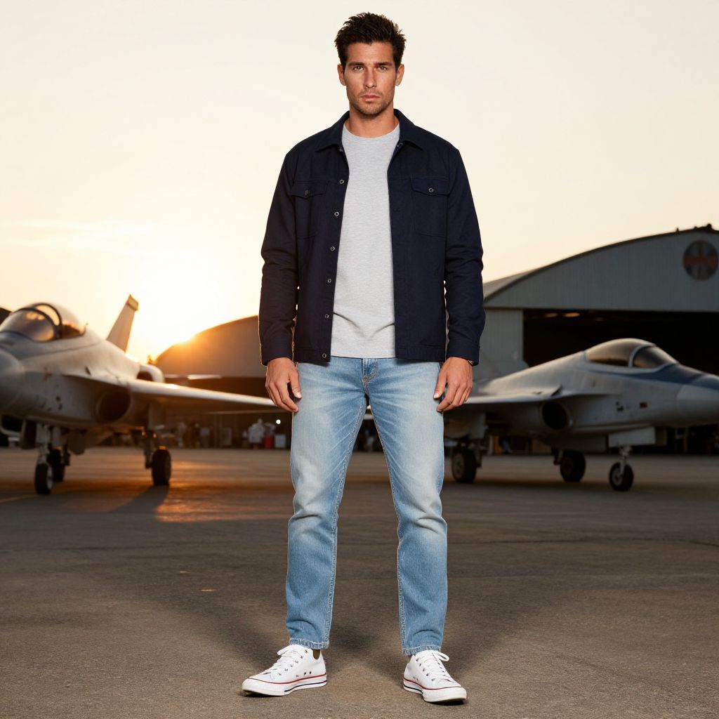 A man, navy blue field jacket, light grey long-sleeve tee, tapered light wash denim jeans, classic white canvas high-tops, runway lined with fighter jets, vintage photo style, confident expression, sun setting behind hangars. Man has masculine face and piercing eyes