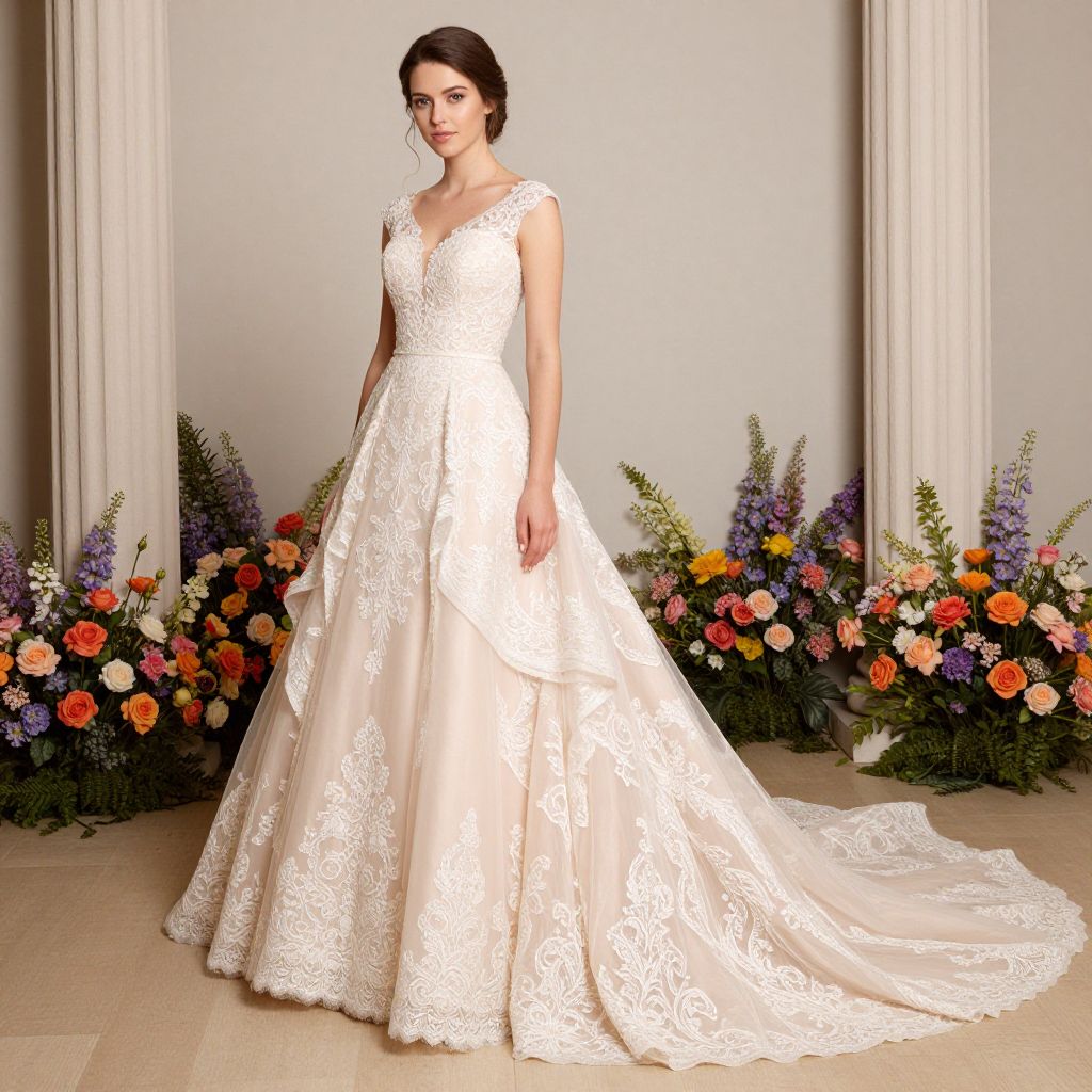 Elegant bride stands gracefully in a blush-toned wedding gown featuring intricate lace detailing and flowing ruffled layers, surrounded by classical columns and a vibrant floral arrangement in a serene indoor setting.