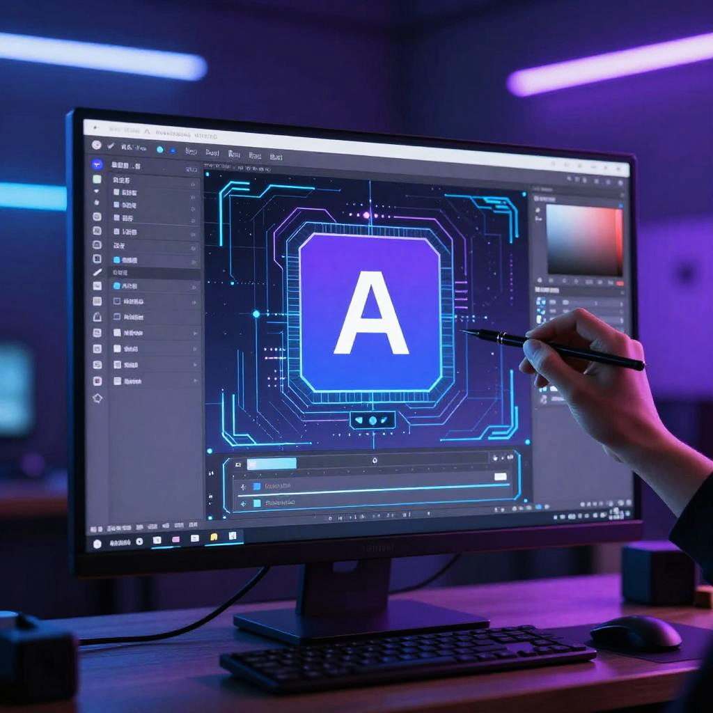 High-tech Adobe remove watermark feature showcased with futuristic UI, holographic displays, digital brushes in use, a creative studio setup, neon blue and purple light accents, intricate detail, cyberpunk-inspired art style