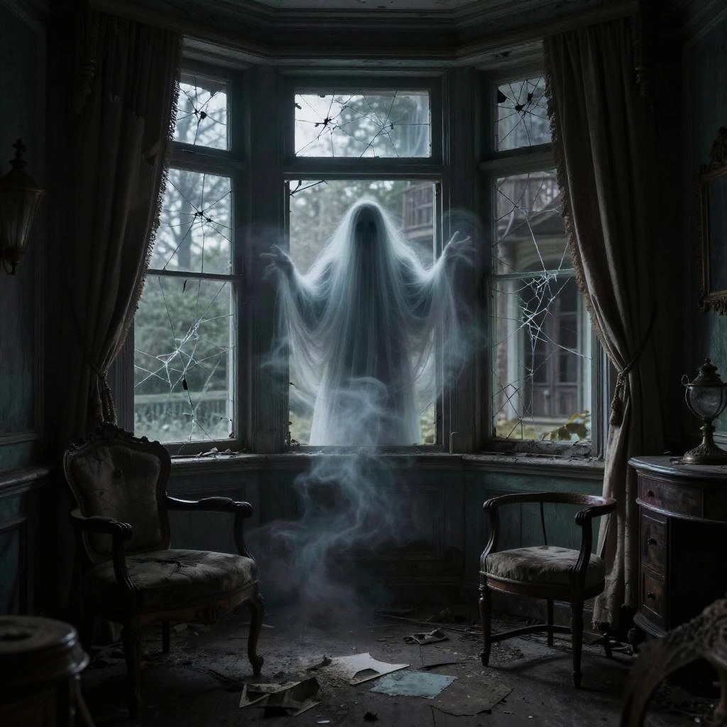 Phantom specter haunting an abandoned Victorian mansion, ghostly presence visible through cracked windows, pale mist weaving through broken furniture and torn curtains, an aura of melancholy and forgotten sorrow, hyper-detailed paranormal artwork with cool color palette