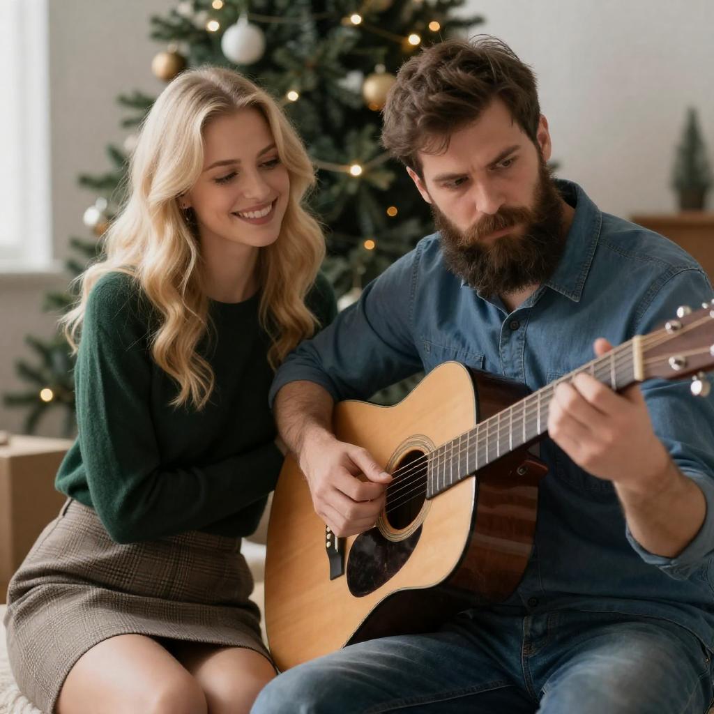 Photograph of a living room. Man with short brown hair, green sweater, and jeans sits on a chair, playing an acoustic guitar. Woman with brown hair, purple velvet dress, and red lipstick sits on a black leather couch, taking a photo with a camera. Christmas tree with red and green ornaments in the background. Black guitar and microphone stand on the floor. Bright window with sheer curtains. Red and black pillows on the couch. White walls. Casual, intimate setting.