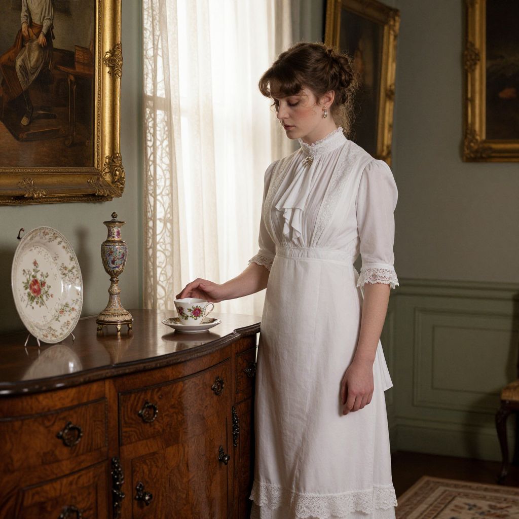 Woman in a Victorian-style white gown stands gracefully beside a polished wooden sideboard, her hand gently touching a floral-patterned teacup as sunlight filters through sheer curtains in a refined interior setting reminiscent of British 1930s impressionist art.