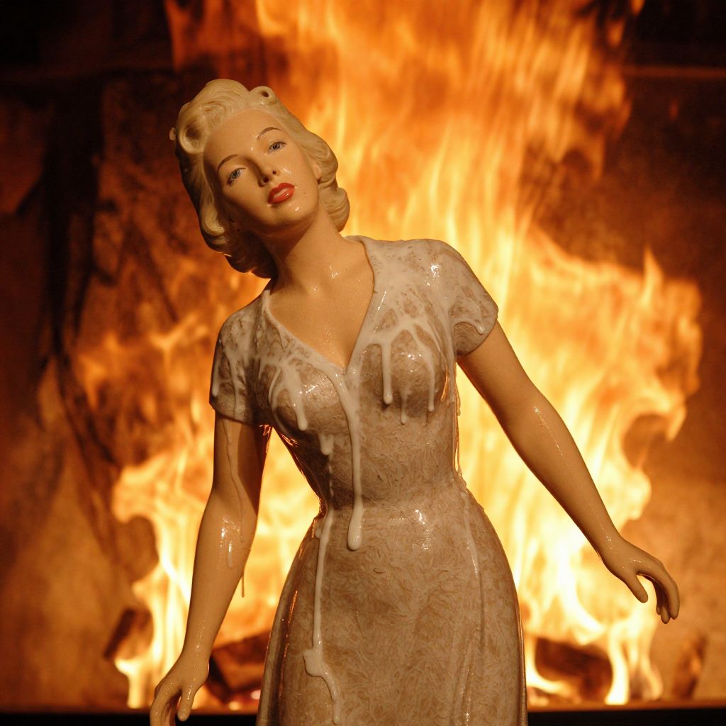 In the image, a wax figure of a 1930s woman is depicted melting from the intense heat of a fire. The woman's skin is covered in a layer of wax, which is slowly liquefying and dripping down her body, creating a striking contrast against the vibrant flames in the background. Her hair is styled in a vintage updo, and she wears a simple, elegant dress that complements the period setting. The fire, with its bright orange and yellow hues, is positioned behind her, casting a warm glow that highlights the details of her melting wax figure. The overall composition is dynamic, with the woman's figure in the foreground and the fire creating a dramatic backdrop, emphasizing the melting effect and the historical context.