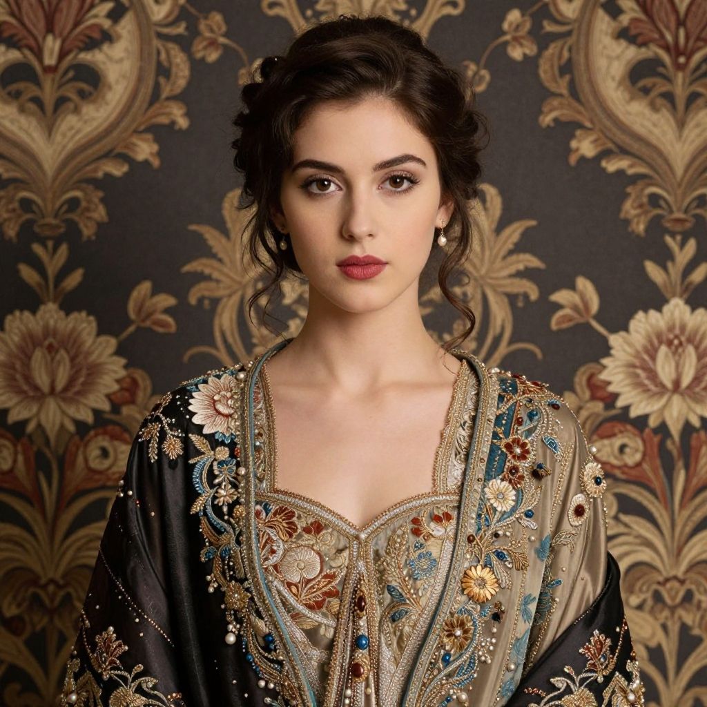 This stunning artwork features a woman in an intricately designed outfit, highlighting a blend of elegance and vintage aesthetics. Set against a beautifully patterned background, the composition showcases detailed floral elements that enhance the overall allure of the piece.