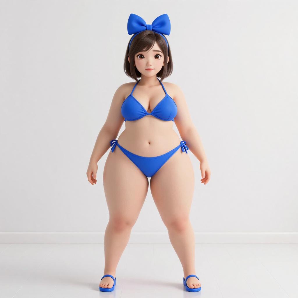 High detailed, masterpiece, 1girl cartoon character in a bikini and blue shoes, short hair, perfect hands, big breast, wide hips, thick thighs, blue bow on her head, ultra realistic digital art, a 3D render, photorealism, clean scene, white background, white wall, shinny floor, white floor
