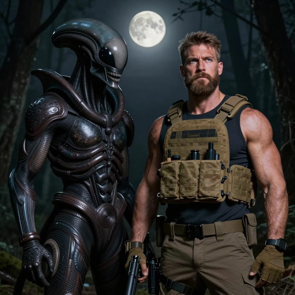 Muscular man with short brown hair and beard, wearing black tactical gear, holding a gun, centered in the foreground. Behind him, large, menacing monster with glowing orange eyes and sharp teeth, surrounded by blue and white mist. Man's expression is determined. Monster's eyes are intense, mouth open in a roar. Blue and white mist partially obscures the bottom of the image.