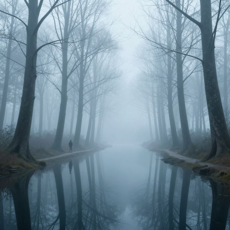 Photograph of a foggy forest path reflected in a still, narrow canal. Tall, leafless trees with dark, textured trunks line both sides of the path, creating a symmetrical, tunnel-like effect. A solitary figure, dressed in dark clothing, walks along the left path, barely visible through the dense mist. The water in the canal is almost mirror-like, capturing the silhouettes of the trees and the figure. The overall color palette is cool and monochromatic, dominated by shades of blue and gray, enhancing the misty, ethereal atmosphere. The background fades into a white, misty blur, adding to the sense of depth and mystery.