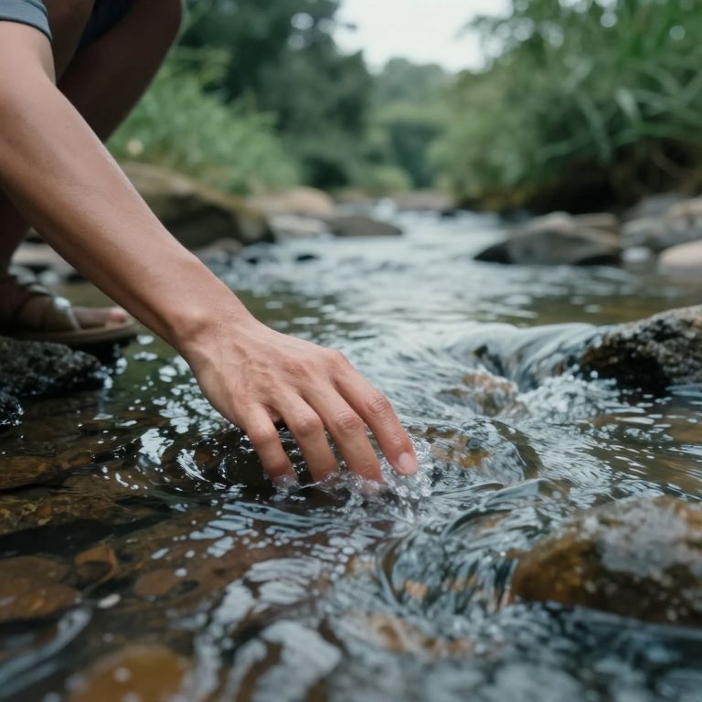 Photograph of a close-up scene featuring a person's light-skinned, slender hand gently touching the clear, flowing water of a shallow creek. The hand is in the left foreground, with water splashing around the fingers. The creek is bordered by smooth, dark brown rocks and surrounded by lush greenery in the blurred background. The person's arm is partially visible, wearing a grey sleeve. The image has a natural, serene atmosphere with a focus on the interaction between the hand and the water. The lighting is soft and natural, enhancing the tranquil setting.