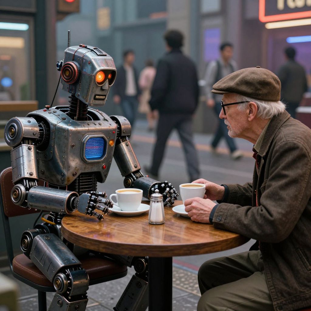 Vintage Sci-fi, A vintage, futuristic diner from the 1950s with robots as waitstaff, The interior is chrome-plated, with retro booth seating and neon accents, A robot waitress in a pink uniform is holding a milkshake, steam rising from its metallic surface, The scene feels playful and nostalgic, whimsical yet retro-futuristic atmosphere