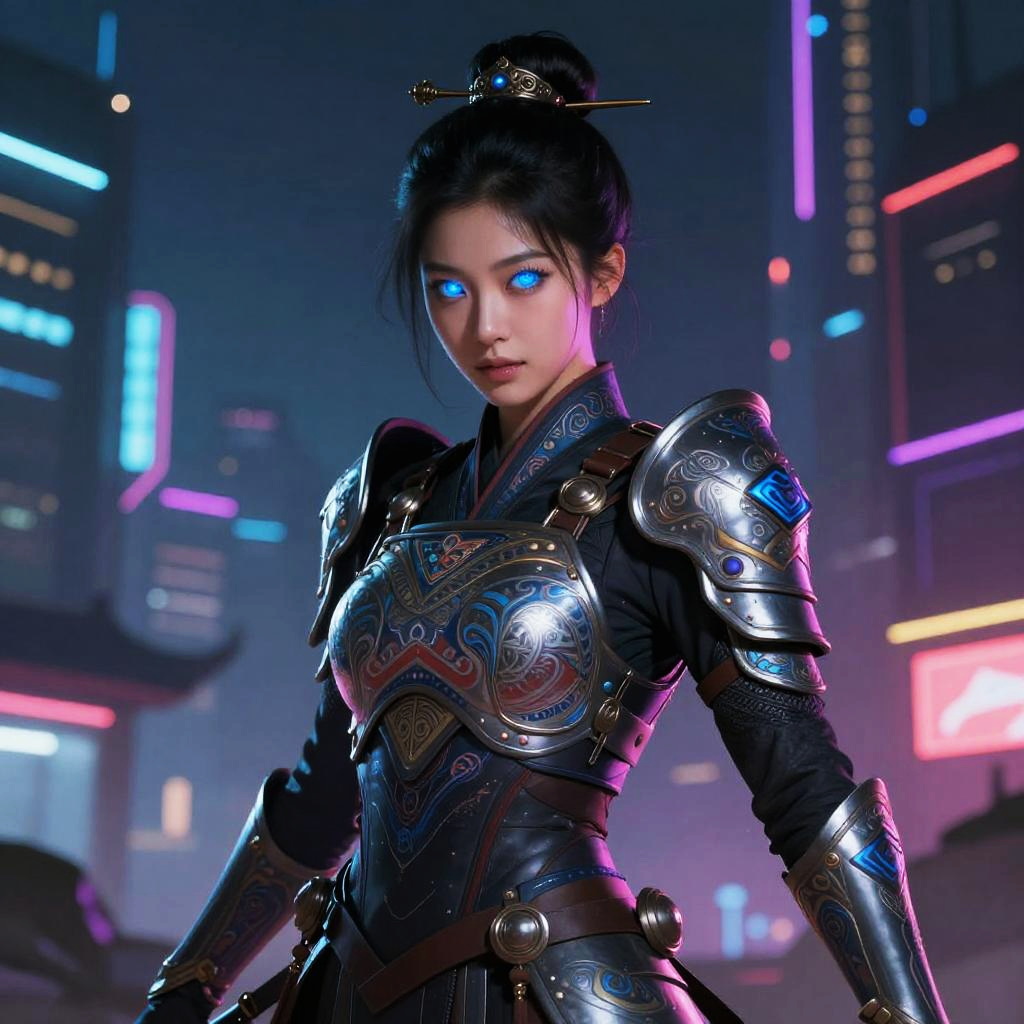 CGI image of an East Asian woman with glowing blue eyes and black hair in a bun, adorned with an ornate hairpin. She wears intricate, silver armored armor with blue and red patterns, covering her chest and shoulders. The background is a futuristic cityscape with neon lights in blue, pink, and purple hues, illuminating tall buildings. The scene has a cyberpunk aesthetic, with a moody, dark atmosphere. The woman's expression is intense and focused, standing out against the vibrant, colorful city lights.