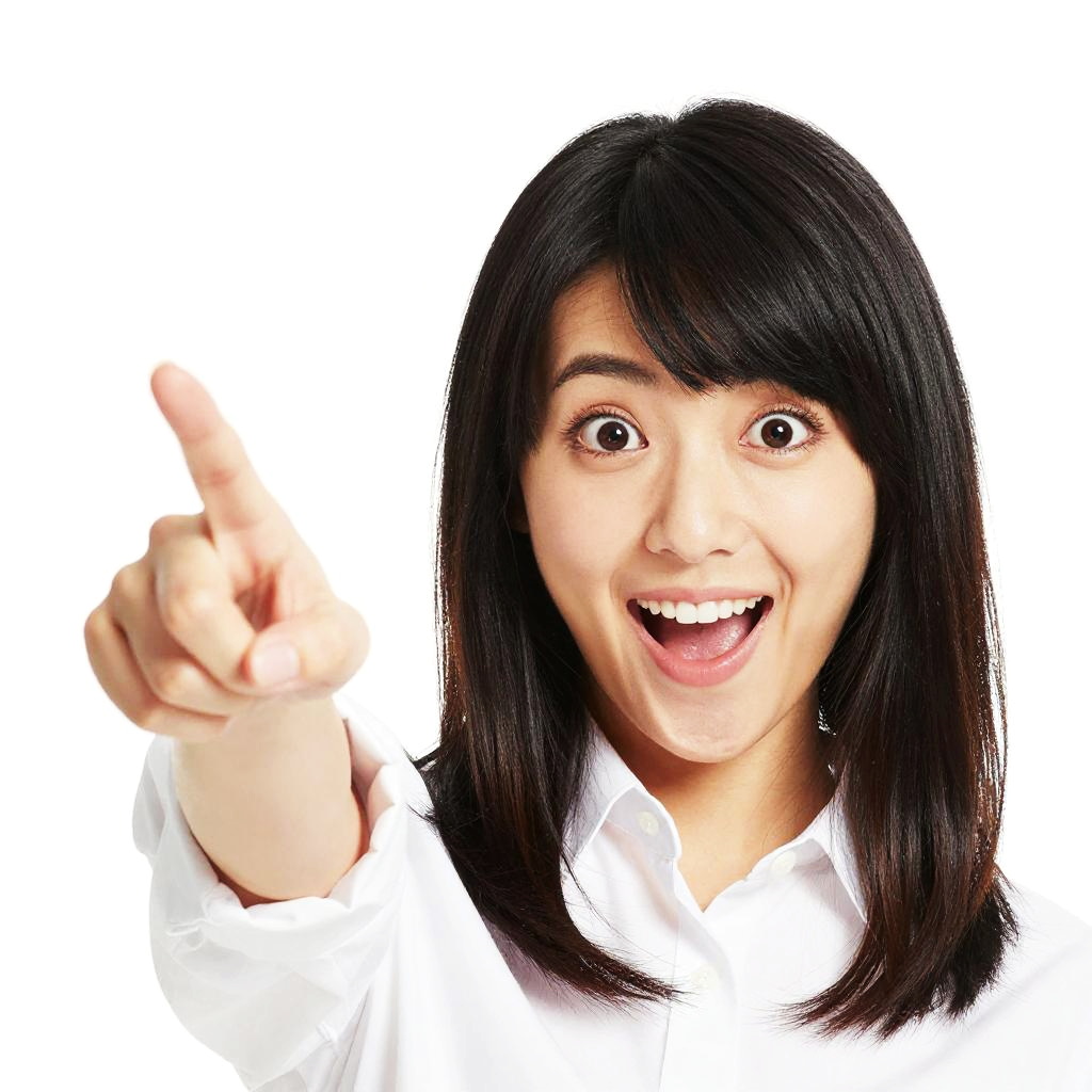 A vibrant photograph of a smiling woman with shoulder-length black hair and bangs. She's pointing with her right index finger and has bright, expressive brown eyes. She wears a white shirt and has a cheerful, open-mouthed expression. The background is completely white, making her the focal point. The image has a playful, energetic vibe.