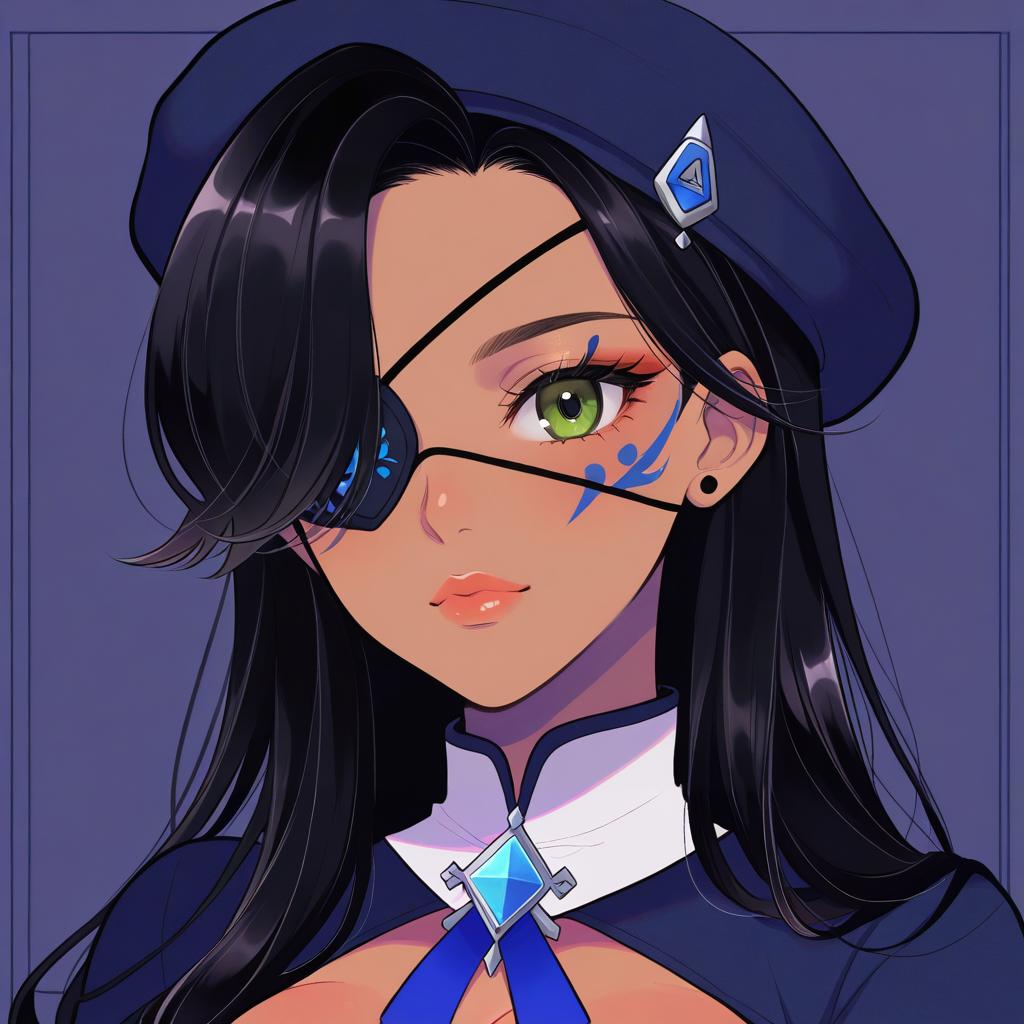 Ana (overwatch), overwatch, 1girl, dark-skinned female, lips, brown eyes, eyepatch, long hair, black hair, large breasts, facial tattoo, facial mark, nose, beret, by artist yasuyuki, illustrious