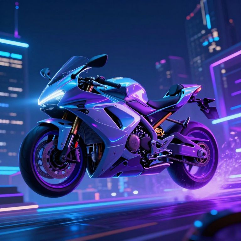 A vibrant, digital CGI image depicting a sleek, silver sport motorcycle with neon blue and purple accents, glowing headlights, and detailed mechanical features. The motorcycle is mid-air, kicking up a spray of purple light against a futuristic, neon-lit cityscape with tall buildings and colorful, illuminated windows. The background is a blur of blue, pink, and purple lights, enhancing the high-speed, dynamic motion of the scene. The image has a cyberpunk aesthetic, emphasizing speed, technology, and a vibrant, nocturnal urban environment.