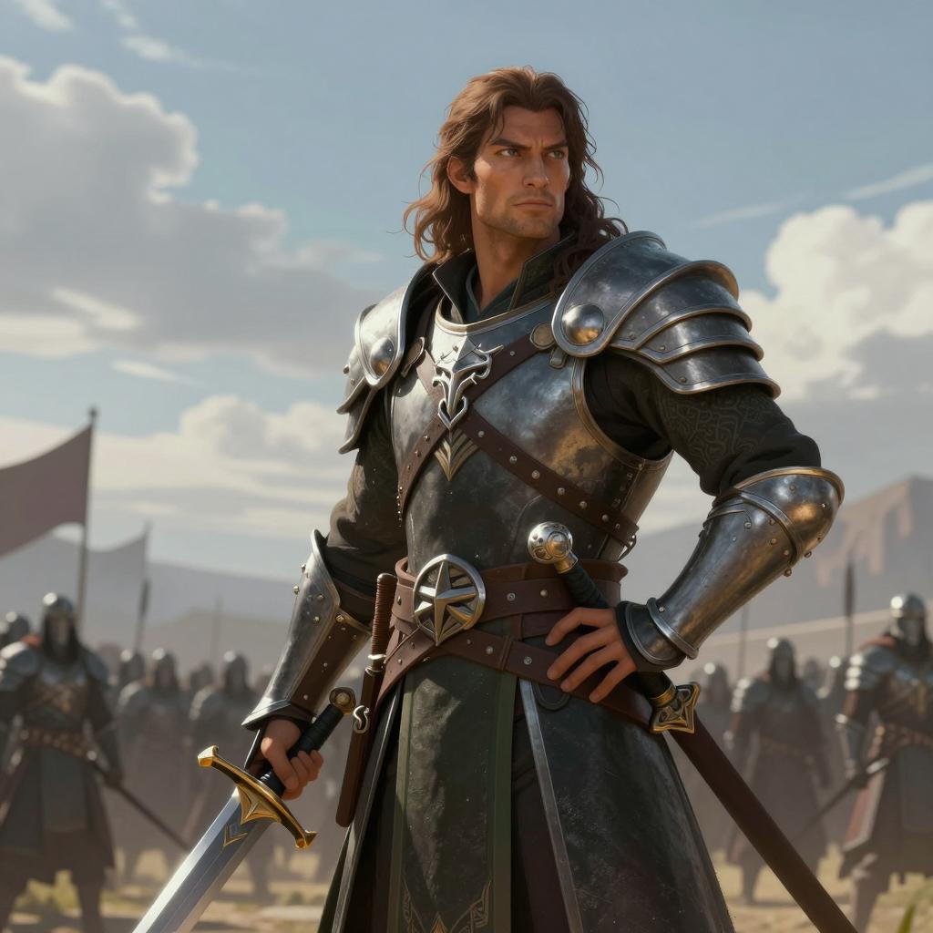 A male warrior with long, wavy brown hair stands confidently, holding a sword in his right hand. He wears a dark, armored tunic with green straps and silver armguards. His left hand rests on his hip. A dense army of silhouetted soldiers stands in the background under a cloudy, blue sky. The warrior's expression is determined. The image has a digital illustration style with a fantasy theme.