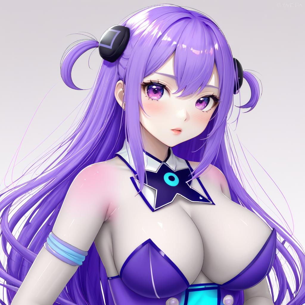 Adult neptune, neptune (series), 1girl, purple eyes, hair between eyes, purple hair, long hair, very long hair, d-pad hair ornament, medium breasts, large breasts, cleavage, by artist ikeuchi tanuma, leet