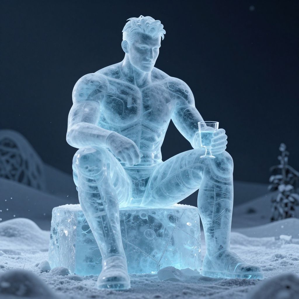 Photograph of a glowing white marble statue of a man in a fur coat, sitting in a plush armchair, holding a steaming cup, surrounded
