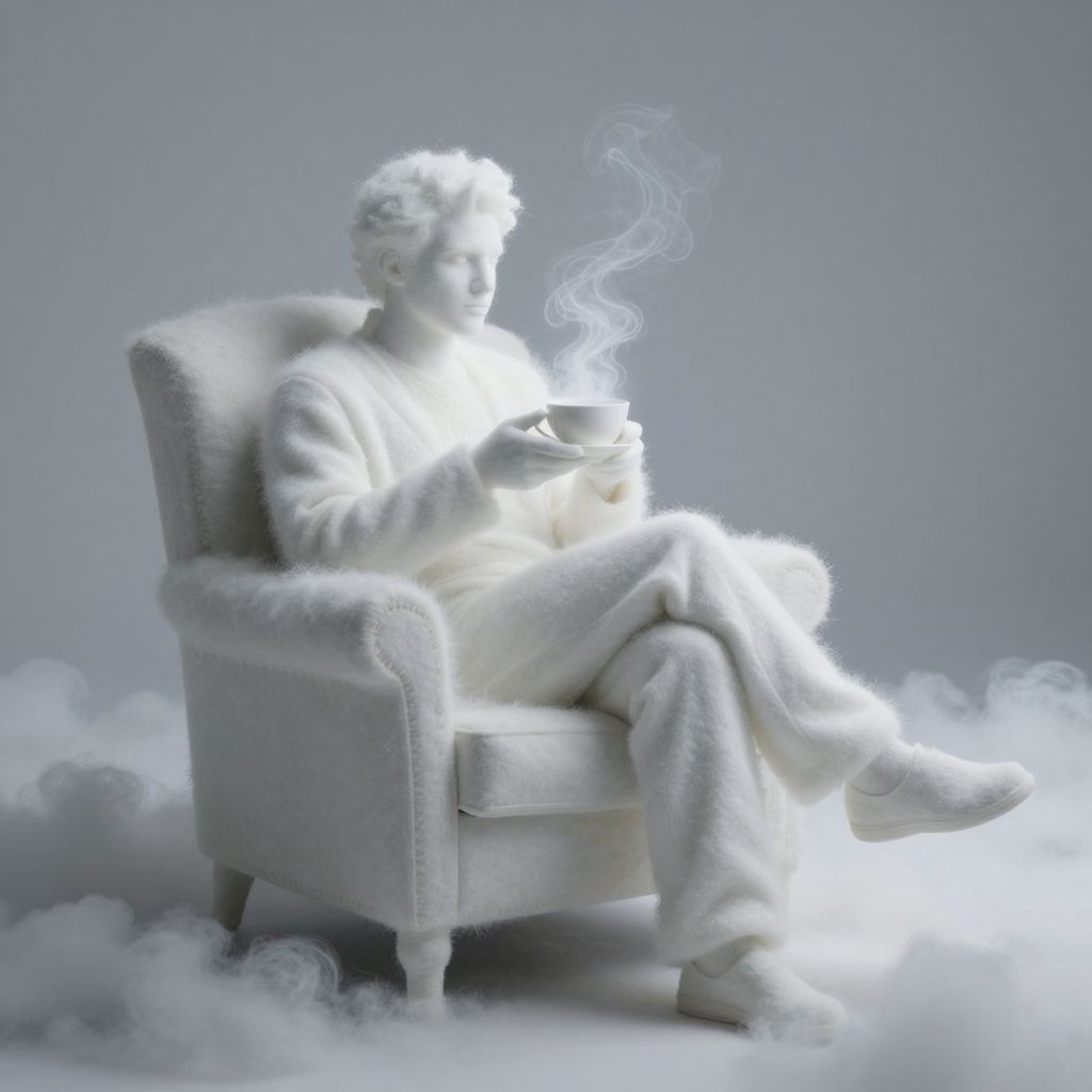 Photograph of a white, ethereal marble statue of a man sitting in a plush, light-grey armchair. The man is dressed in a textured, fluffy robe, holding a steaming cup in both hands. His short, curly hair is detailed, and he has a calm expression. The background is a gradient of grey to white, with soft, misty clouds at the base. The statue's luminous quality contrasts with the matte textures of the armchair and robe, creating a surreal, dreamlike atmosphere.