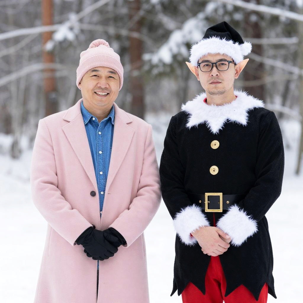 Photograph of two men standing outdoors in a snowy forest. The man on the left wears a pink coat, matching hat, blue shirt, and black gloves, smiling. The man on the right wears a black elf costume with white fur trim, red accents, black belt, and glasses, looking slightly serious. Both have hands clasped in front. Snow-covered trees in the background.