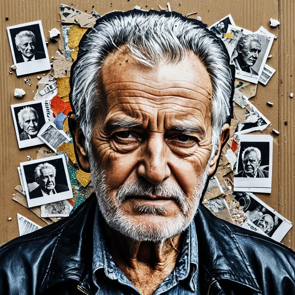 Hyper-detailed portrait of an elderly man with salt and pepper hair, styled as a multi-layered collage on cardboard. The artwork combines edgy street art elements with fragmented celebrity-like black and white images surrounding the central realistic portrayal, creating a striking contrast between colors and textures.