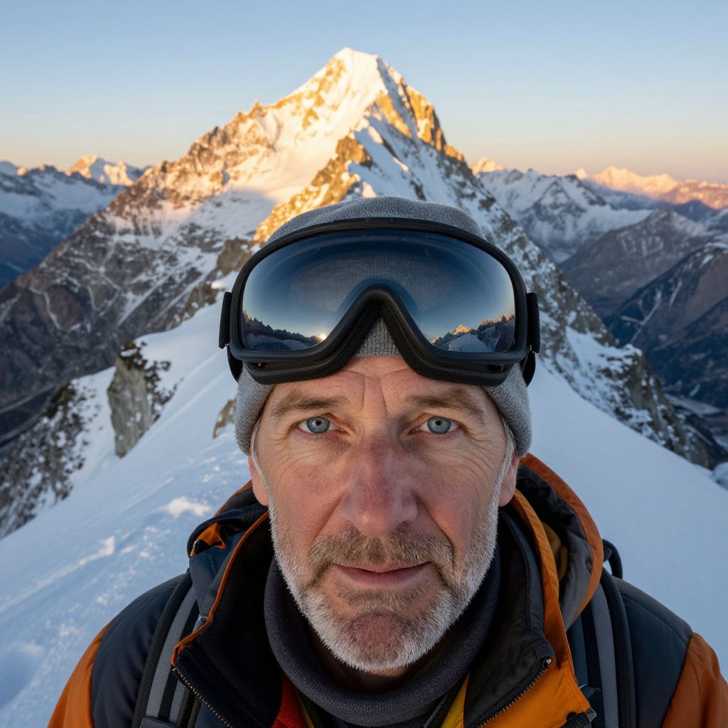 Photograph of a middle-aged man with light blue eyes, gray beard, and fair skin, wearing black ski goggles with reflective lenses, a gray beanie, and an orange and black winter jacket. He stands on a snowy mountain peak with a sunlit, jagged mountain range in the background. The sky is clear with a slight blue hue. The man's expression is serious, and he gazes directly at the camera. The snow-covered landscape and bright sunlight on the distant peaks create a vivid contrast.