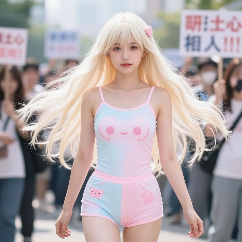 Photograph of an East Asian young woman with long, platinum blonde hair and fair skin, wearing a white and pink tank top with a cute cat face print and matching pink and white shorts. She stands in a sunlit urban street protest, surrounded by blurred crowd members holding signs with Chinese characters. Her expression is neutral, and she has a small pink hair accessory in her hair. The background is filled with protesters, and the image has a bright, almost overexposed look, emphasizing her hair and outfit.