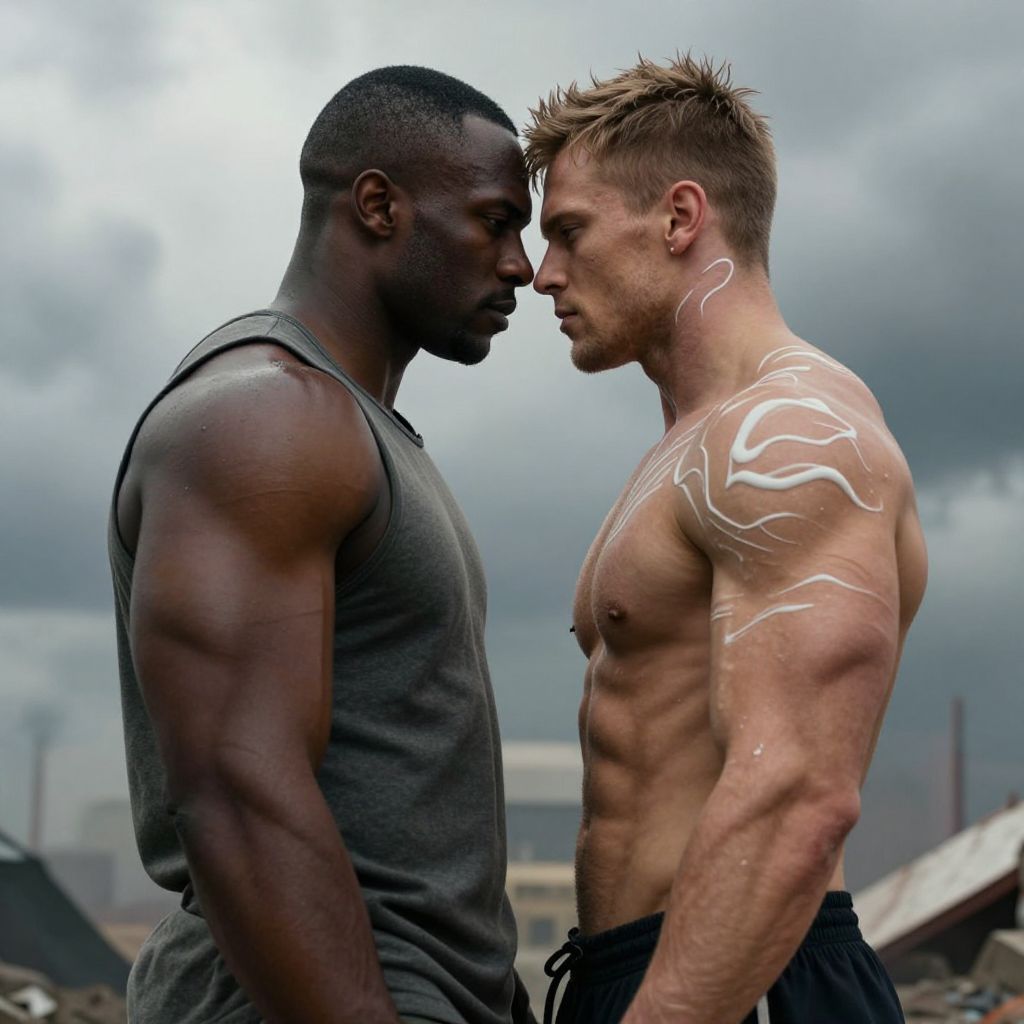 In this highly detailed and photorealistic image, two muscular individuals stand in close proximity, their bodies aligned in a dynamic pose. The person on the left, a 30-year-old black man, is depicted with a well-defined physique, his muscles rippling under the light. He wears a sleeveless top, revealing his chiseled arms and torso. The person on the right, a 25-year-old white man, is equally muscular, with a more pronounced and intricate body structure, his skin adorned with white, wavy patterns that add a surreal touch to his appearance. The background is a dramatic, cloudy sky, suggesting an apocalyptic setting, with the two figures standing in the foreground, their faces close together, creating a sense of intimacy amidst the chaos. The overall composition is balanced, with the two figures centrally positioned, their bodies almost touching, emphasizing the connection between them.