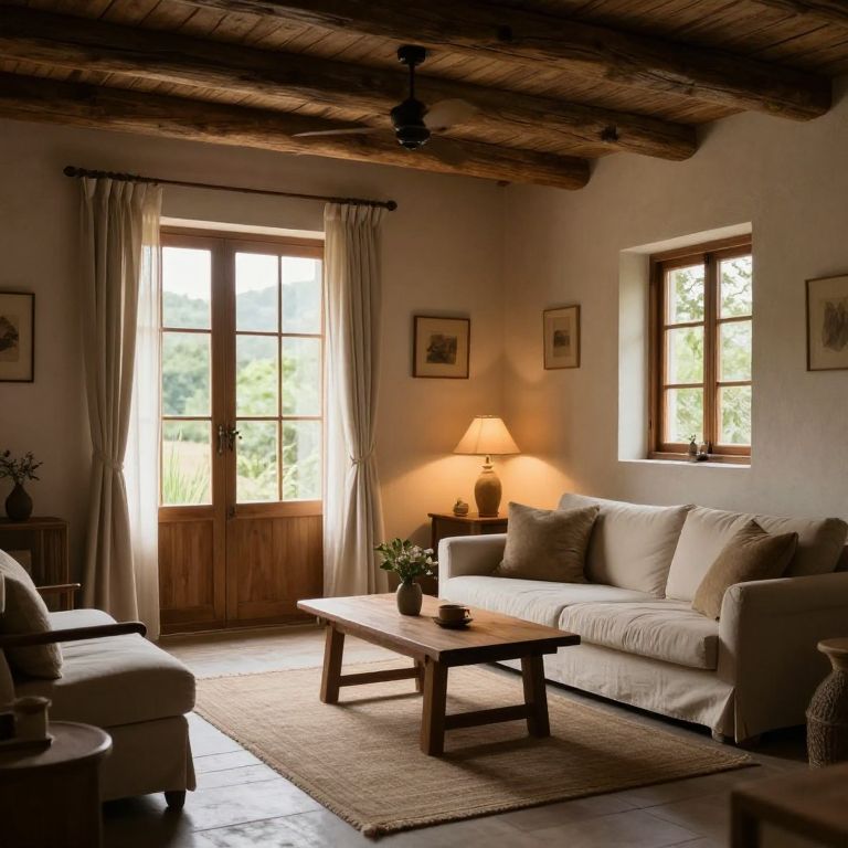 An inviting rustic retreat where earthy tones and natural light converge, fostering a sense of serenity and timeless comfort, while the soft glow of lamps and the gentle rustle of curtains evoke a quiet symphony of peace and introspection.