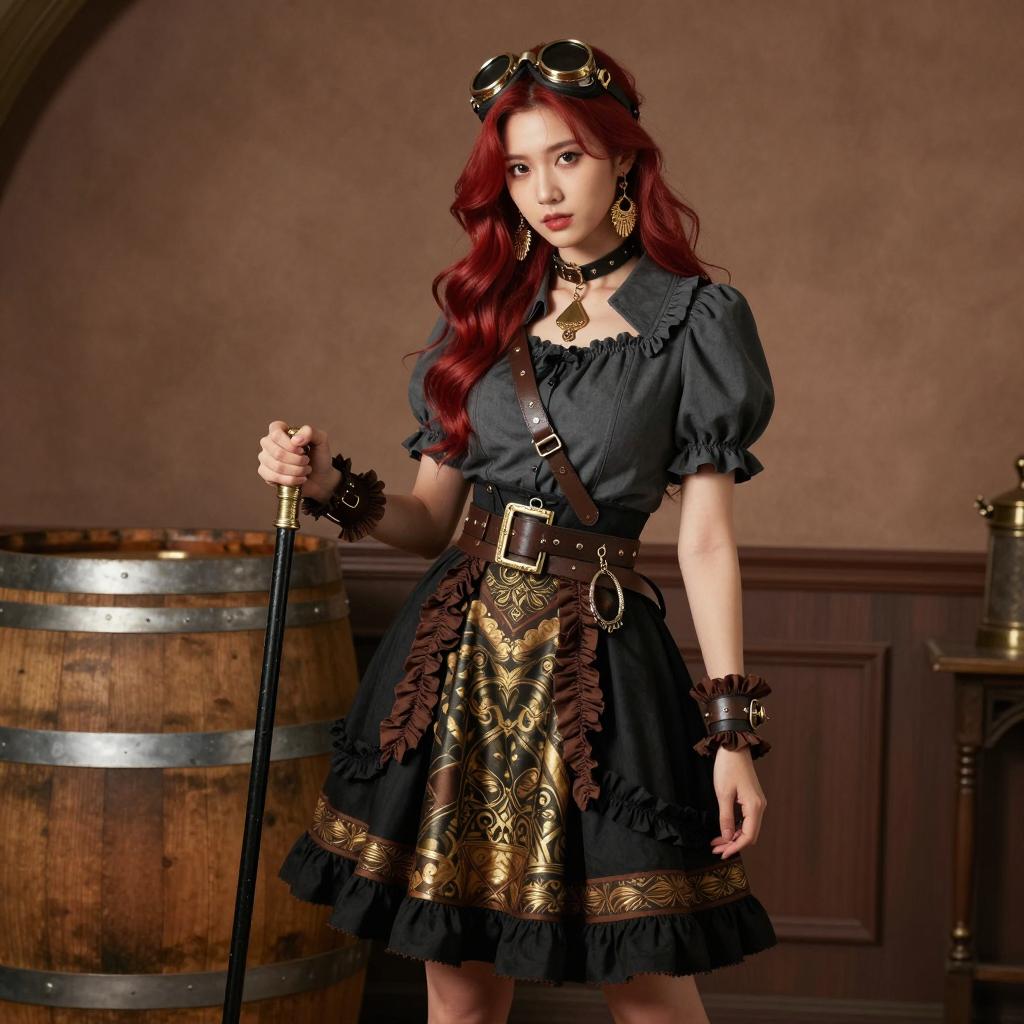 Portrait of an Asian woman with long red hair wearing a stylish steampunk outfit indoors. She is dressed in a dark gray blouse with puffed sleeves and a black skirt adorned with gold and brown intricate patterns and frilled trim. Accessories include gold earrings, a choker necklace, a wide belt with a buckle, leather wrist cuffs, and vintage goggles worn on her head. She holds a black cane with a gold handle and stands against a brown textured wall near a large wooden barrel.