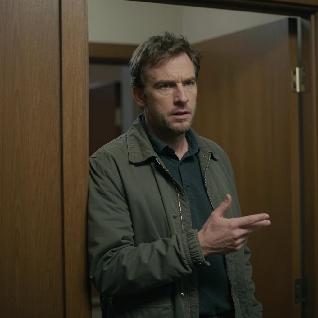 Photograph of two men in a dimly lit, cluttered room. Man on left with glasses, white shirt, bloodstains, holding green-tipped syringe, intense expression. Man on right, striped shirt, short brown hair, leaning forward, smiling. Background has wooden shelves and boxes.
