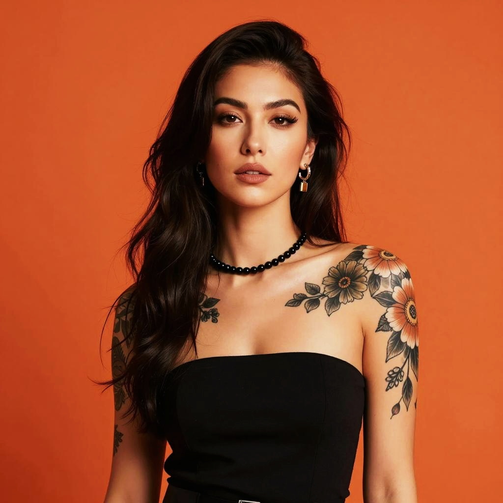 A confident woman with long dark hair poses against a vibrant orange background, showcasing intricate floral tattoos on her shoulders. She wears elegant earrings and a black necklace, complemented by a stylish black top, creating a striking and modern portrait.