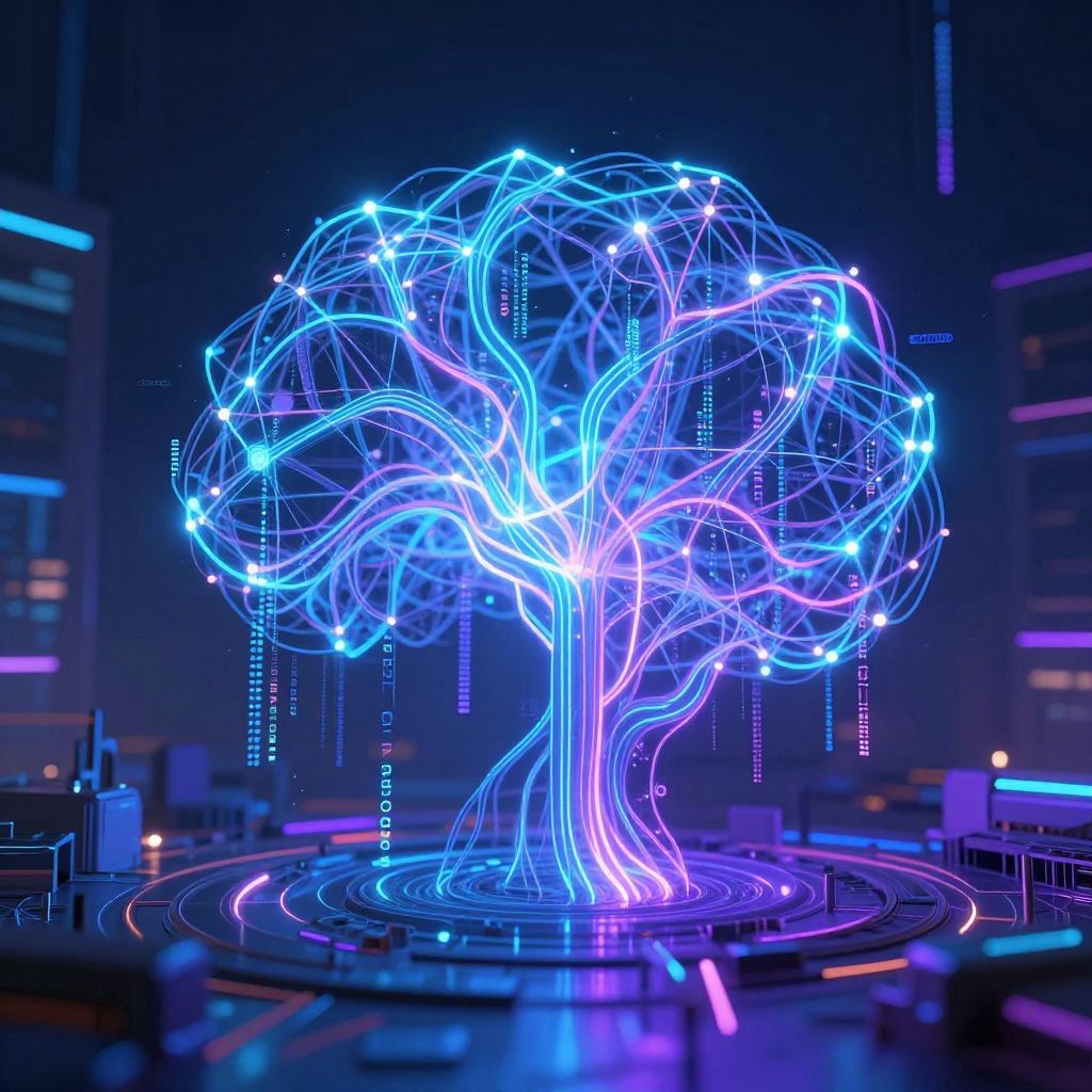 Embedding stable diffusion visualized as glowing neural networks intertwining with vibrant data streams in a futuristic digital landscape, high detail, cyberpunk aesthetic, blue and purple hues