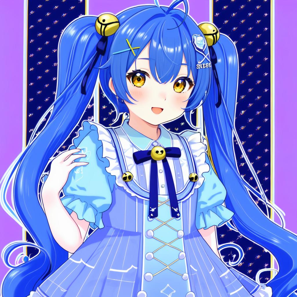 Amamiya kokoro, nijisanji, 1girl, skin fang, yellow eyes, hair between eyes, blue hair, very long hair, long hair, x hair ornament, ahoge, two side up, twintails, hair bell, hair ribbon, small breasts, virtual youtuber, virtual youtuber, jingle bell, by artist takase muh, anime