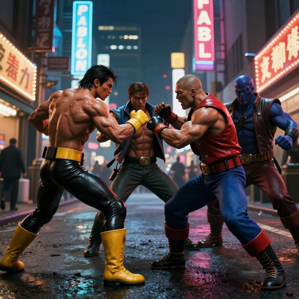 Final Fight characters in dynamic urban battle scene, gritty city streets at night, detailed muscular heroes and villains clashing, vibrant neon signs glowing, comic book style