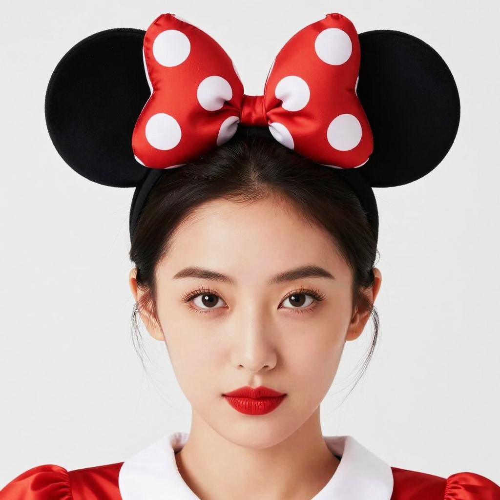 Photograph of an Asian woman with fair skin and black hair styled in a bun, wearing large black Mickey Mouse ears adorned with a red bow with white polka dots. She has red lipstick, subtle eye makeup, and is dressed in a red top with a white collar. The background is pure white, making her the focal point. The image has a clean, vibrant, and slightly stylized look, emphasizing the iconic Disney character elements.