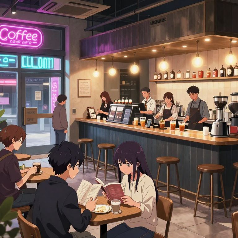 Anime cafe background, bustling urban coffee shop with neon signs outside, baristas preparing drinks behind the counter, sleek modern decor mixed with vintage elements, lively atmosphere, characters chatting and reading, detailed shading and dynamic lighting effects.