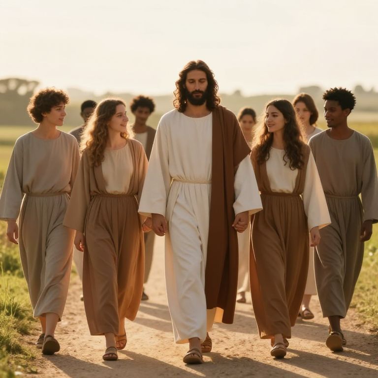 Walking Jesus holding hands with people of different ages and cultures, walking through a golden field during sunset, tranquil and uplifting mood, natural and flowing movement, realistic textures on clothing and environment, soft light highlighting faces.